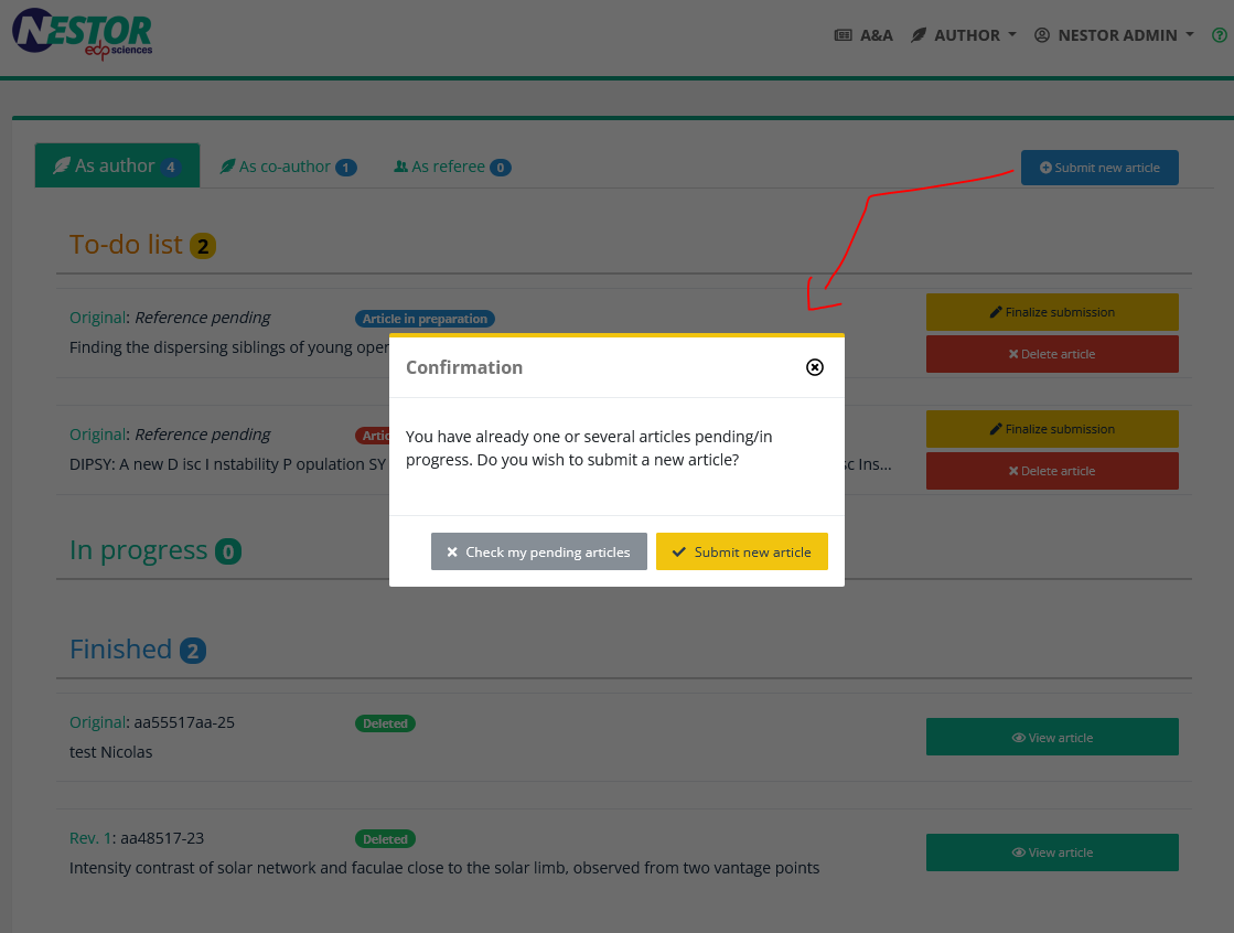 Before creating a new submission, Nestor will check if the author already has a paper ongoing. The idea is to prevent unintended duplicates at revision.